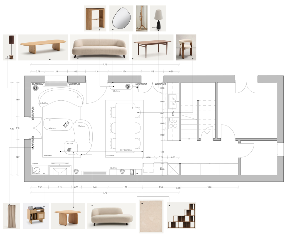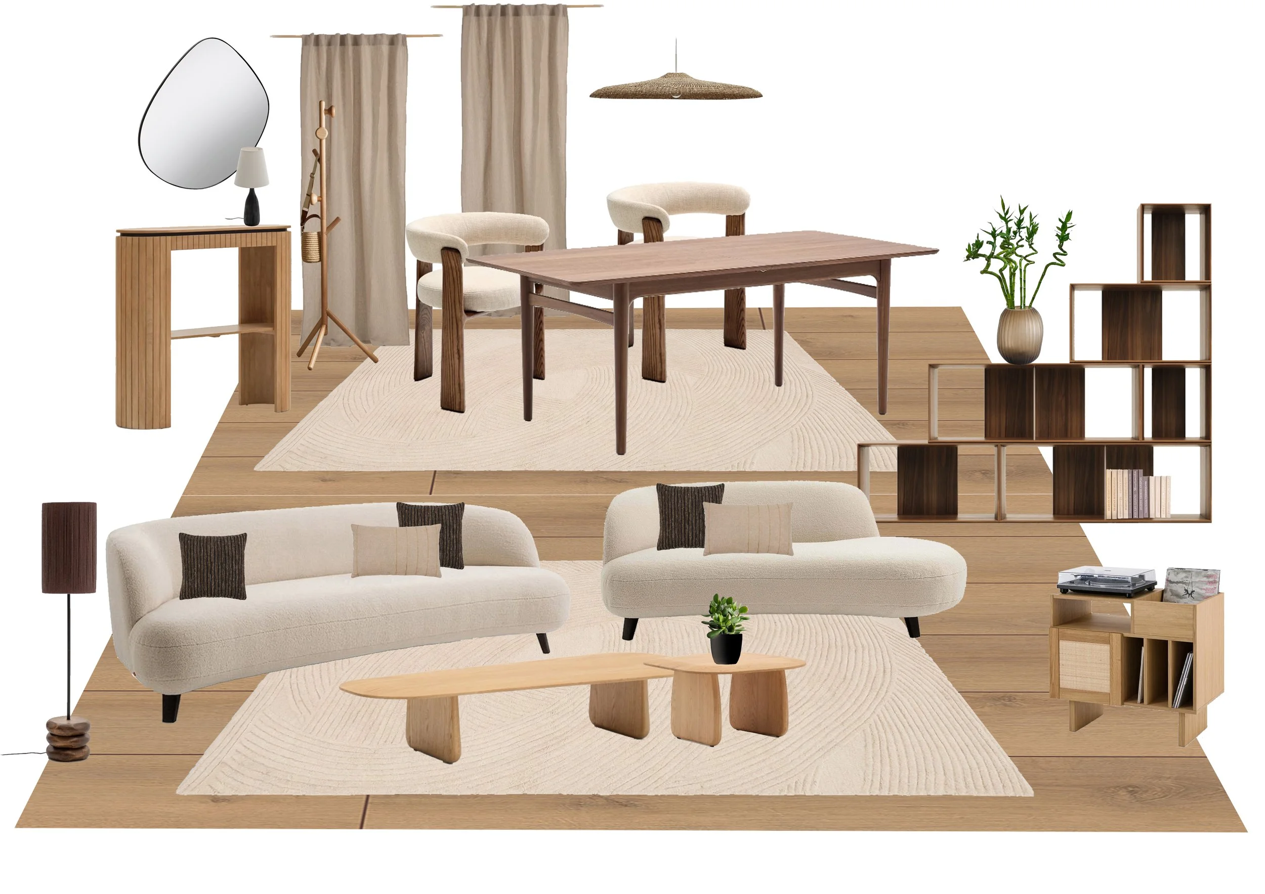 Μέσα από ένα εμπνευσμένο concept board, επιλέγουμε διακοσμητικά στοιχεία και αντικείμενα μεγάλης κλίμακας, όπως έπιπλα, κουρτίνες, χαλιά και φωτιστικά σώματα, που εναρμονίζονται με την αισθητική σας και τις ανάγκες του χώρου σας.